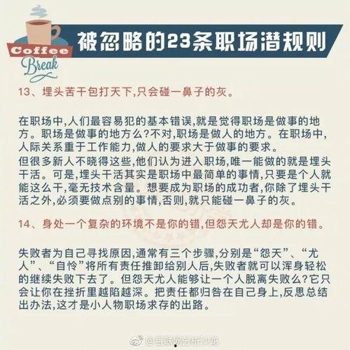 职场潜规则无处不在,了解它们,运用它们,才能让你在职场上如鱼得水。所以,从现在开始,让我们一起揭开这些潜规则的神秘面纱,迈向成功的职场人生吧!